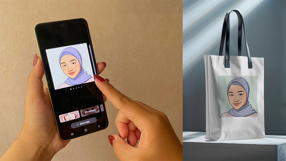 Selain bikin stiker yang personalized, Portrait Studio juga bisa membantu kamu untuk membuat ragam merchandise menarik. Pertama, buat karakter AI dengan cara yang telah dijelaskan sebelumnya, yaitu ambil foto selfie, masukkan ke Portrait Studio, lalu generate gambar rekayasa yang diinginkan.