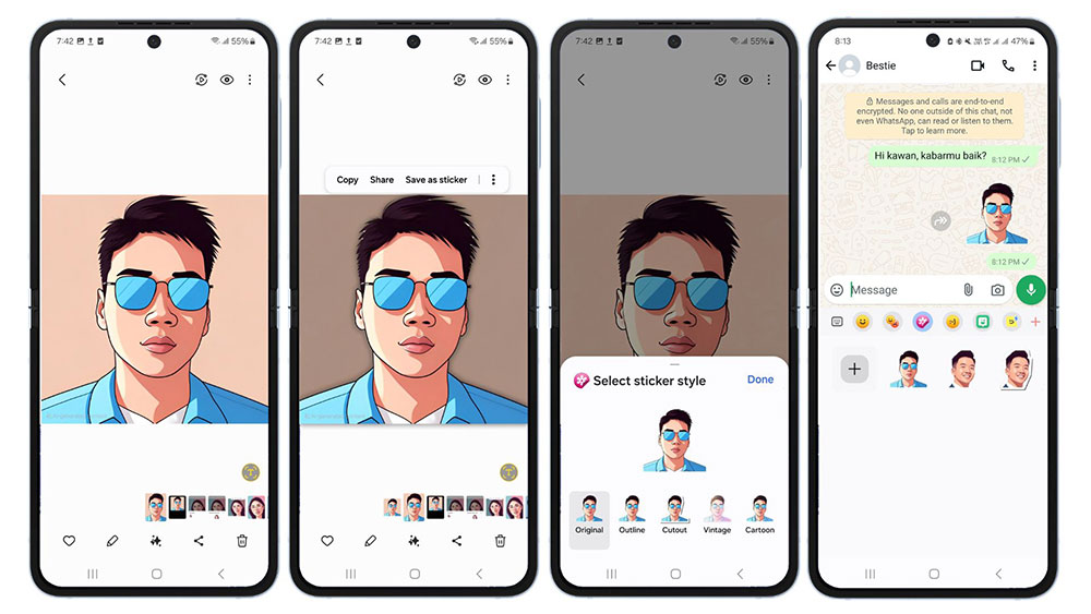 Kalau sebelumnya kita harus mengunduh aplikasi atau pakai situs web tertentu untuk bikin avatar AI, sekarang kita bisa mendapatkannya dengan lebih praktis menggunakan fitur Portrait Studio di Galaxy AI yang ada di Galaxy Z Fold6 | Z Flip6. Portrait Studio bisa generate karakter AI yang lucu dan unik dalam waktu yang begitu cepat, kurang dari semenit! Menariknya lagi, aset visual yang kita dapat tidak hanya bisa digunakan untuk menjadi profile picture, tapi juga bisa menjadi merchandise hingga materi presentasi.