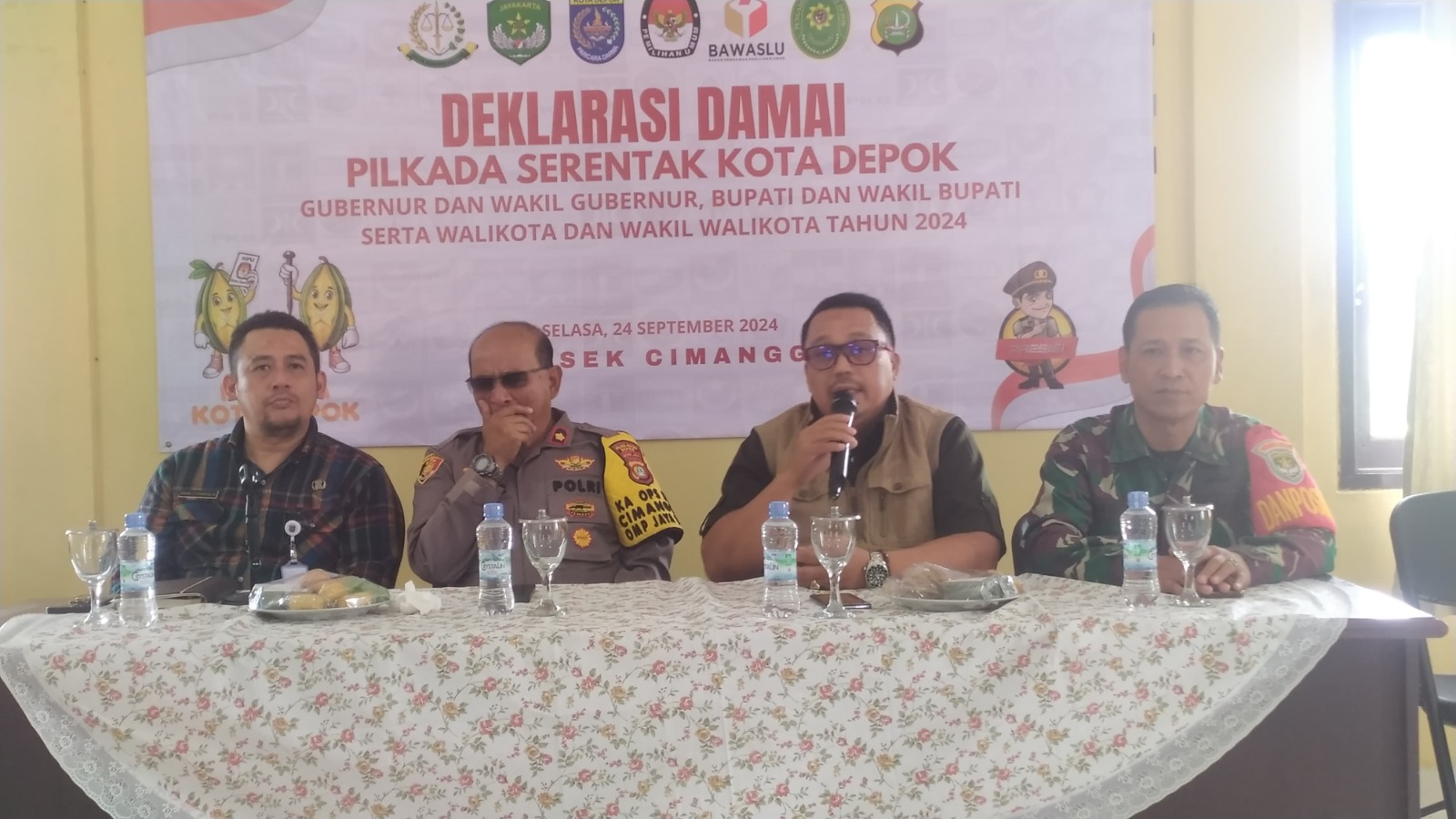 Depok – Kapolsek Cimanggis, Kompol Tatang, menghadiri dan memantau langsung kegiatan Deklarasi Damai dalam rangka Pilkada Serentak tahun 2024 yang meliputi Pemilihan Gubernur dan Wakil Gubernur Jawa Barat serta Pemilihan Walikota Depok.(24/09/2024).