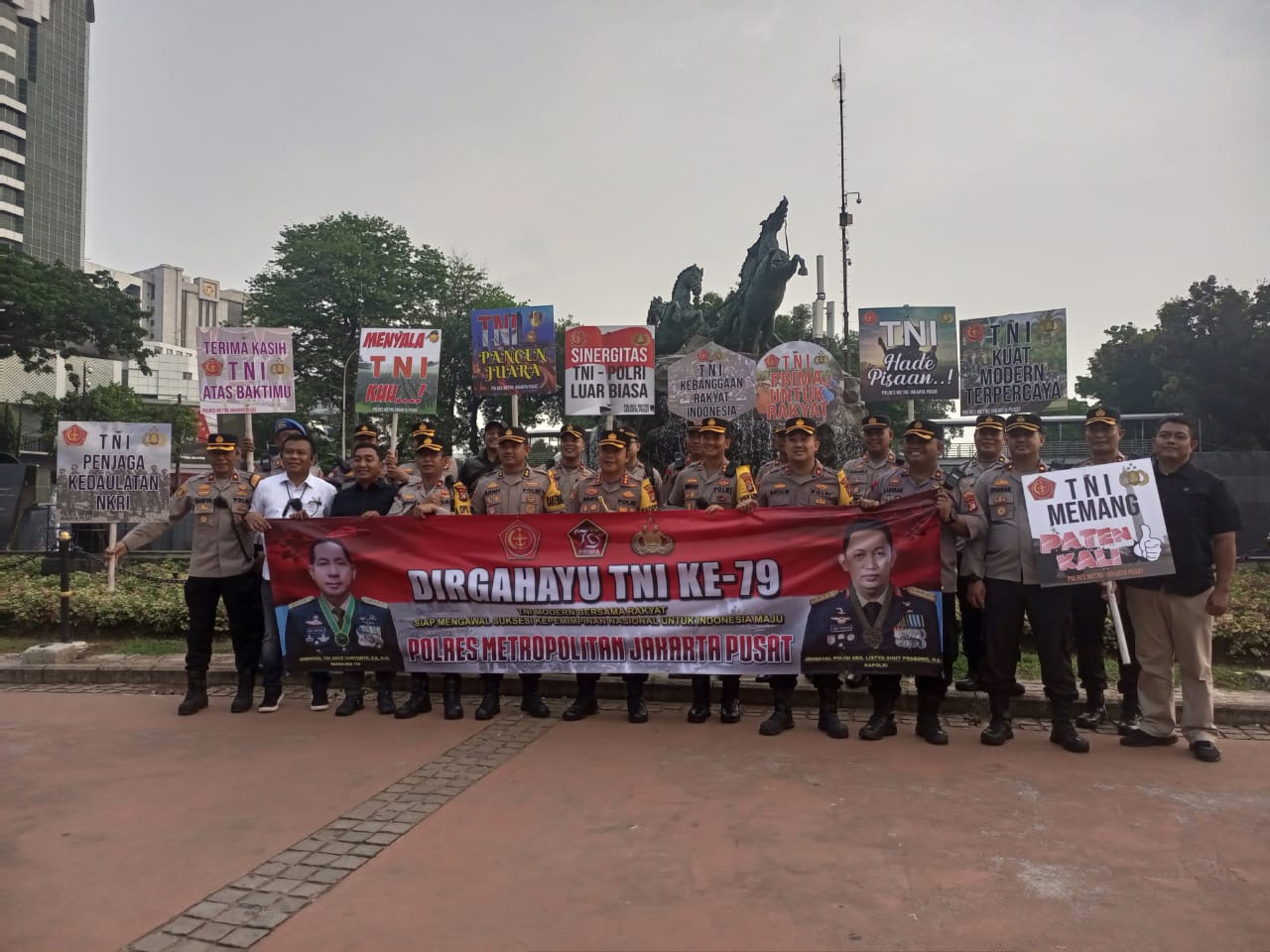 Jakarta Pusat – Kapolres Metro Jakarta Pusat Kombes Pol Susatyo Purnomo Condro bersama Pejabat Utama Polres Metro Jakarta Pusat di Patung Kuda Monas Jakarta Pusat, petugas kepolisian berjajar dan sambil membawa spanduk dan papan ucapan di HUT TNI Ke-79.