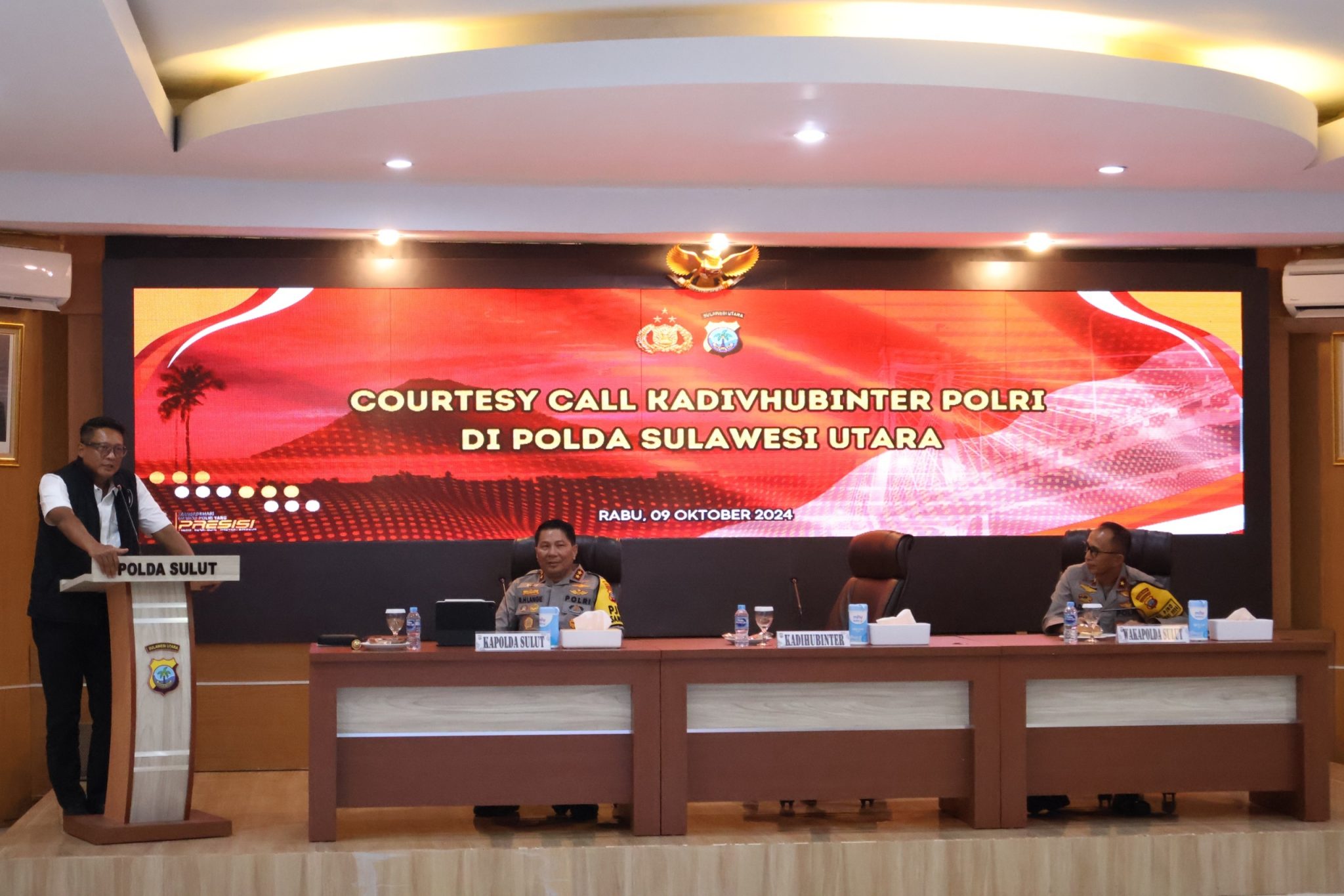 MANADO, – Kadiv Hubinter Polri Irjen Pol Krishna Murti lakukan Courtessy Call bersama Kapolda Sulawesi Utara Irjen Pol Roycke Harry Langie, di aula Tribrata Polda Sulut, Rabu (9/10/2024).