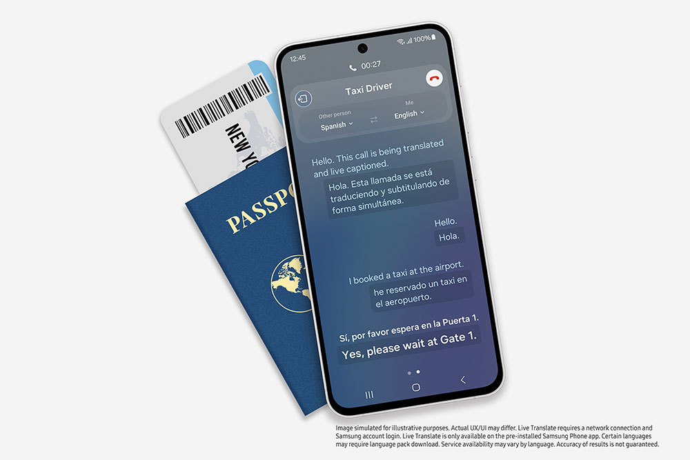 [11] Fitur Live Translate untuk Call Assisst tidak memerlukan koneksi jaringan. Panggilan memerlukan koneksi jaringan untuk mengaktifkan Live Translate. Diperlukan login Samsung Account. Live Translate hanya tersedia pada aplikasi Samsung Phone yang sudah diinstal sebelumnya dan beberapa aplikasi pihak ketiga. Ketersediaan layanan mungkin berbeda menurut bahasa atau wilayah. Bahasa tertentu mungkin memerlukan pengunduhan paket bahasa. Keakuratan hasil tidak dijamin.