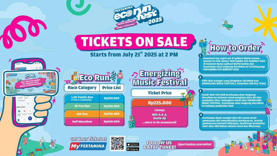 Jakarta, 20 Juli 2025 — PT Pertamina (Persero) secara resmi akan membuka penjualan tiket Pertamina Eco RunFest 2025 mulai Senin, 21 Juli 2025 pukul 14.00 WIB melalui aplikasi MyPertamina.