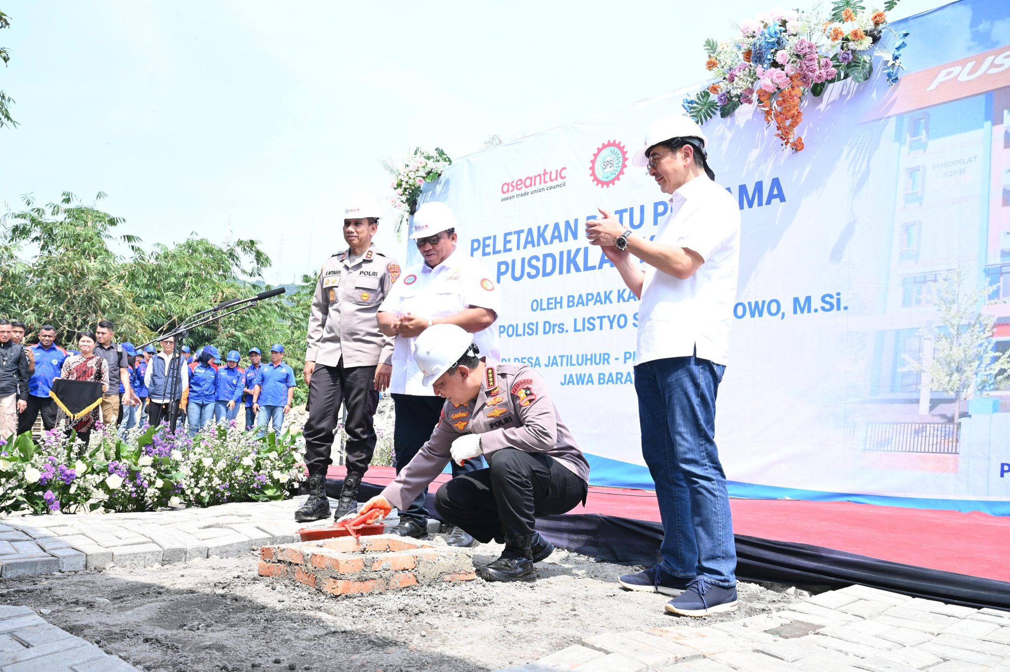 Kapolri Jenderal Polisi Drs. Listyo Sigit Prabowo, M.Si melaksanakan kegiatan peletakan batu pertama pembangunan gedung Pusdiklat Konfederasi Serikat Pekerja Seluruh Asean Trade Union Council (KSPSI ATUC) di Jln. Raya Waduk Jatiluhur Kp. Sukahurip RT 008 RW 005 Desa Jatiluhur Kec. Jatiluhur Kab. Purwakarta. Rabu (7/08/2024).