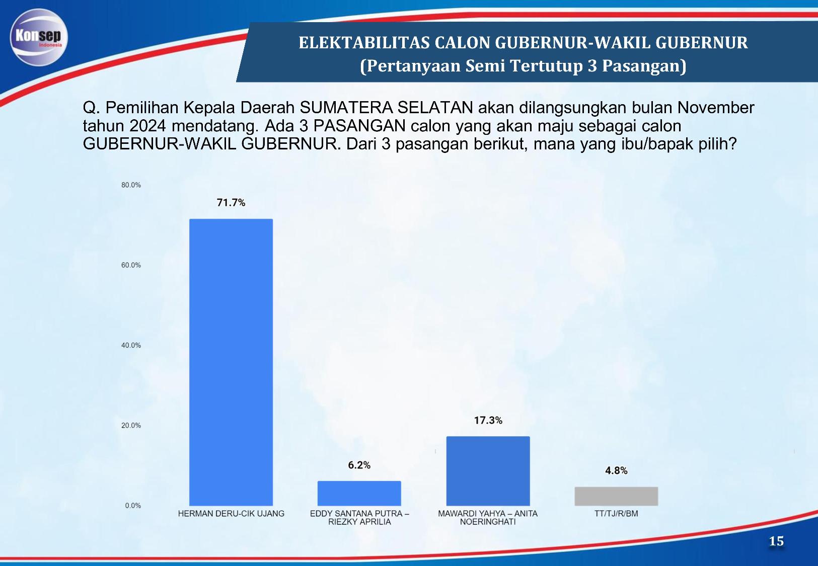 Lembaga survei Konsep Indonesia kembali merilis survei terkait elektabilitas calon gubernur dan wakil gubernur Sumatera Selatan 2024. Hasilnya, elektabilitas Herman Deru – Cik Ujang tembus 71,7%.