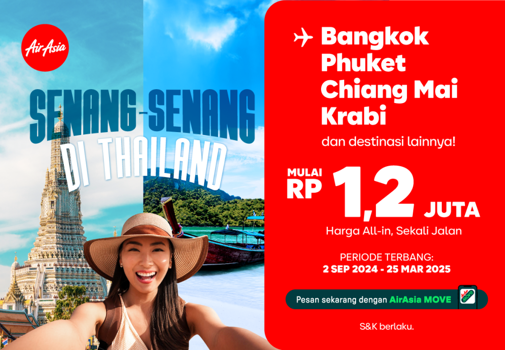 Jakarta, 19 Agustus 2024 — Maskapai berbiaya hemat terbaik dunia selama 15 kali berturut-turut versi Skytrax, AirAsia kembali hadir dengan penawaran spesial bagi para wisatawan. Kini, wisatawan di seluruh Indonesia dapat menikmati penerbangan ke destinasi populer di Thailand dengan harga yang sangat terjangkau. Dengan periode pemesanan yang hanya berlangsung dari 19 hingga 25 Agustus 2024, inilah waktu yang tepat untuk merencanakan perjalanan impian ke Thailand.