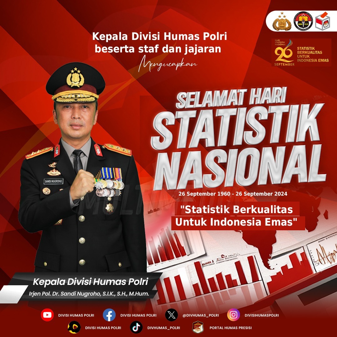 Jakarta. Memperingati Hari Statistik Nasional yang jatuh pada setiap 26 September, Mabes Polri mengucapkan selamat Hari Statistik Nasional ke-64.