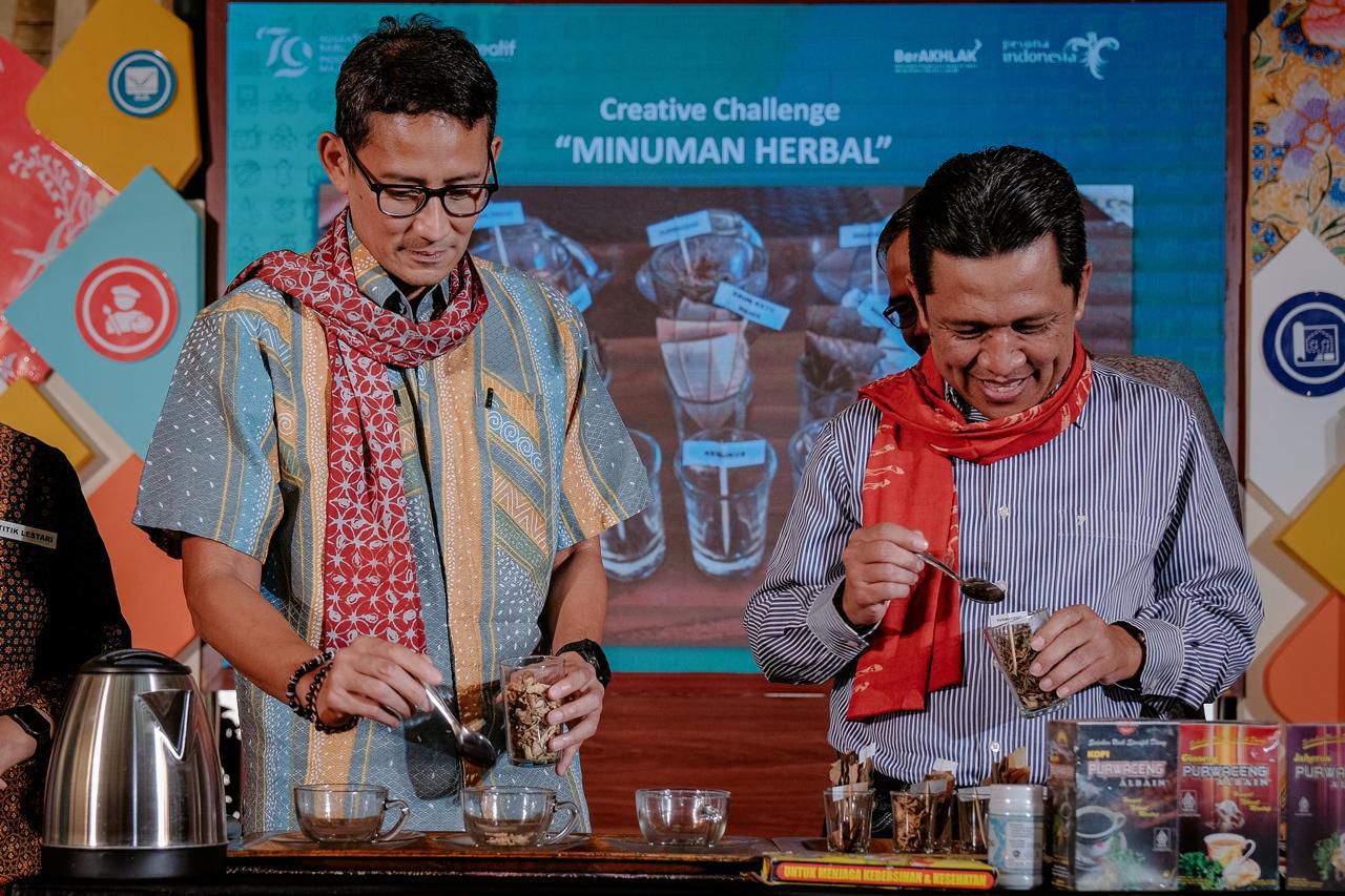 Menparekraf Sandiaga Uno (kiri) membuat minuman khas Wonosobo dalam segmen Creative Challenge saat acara Workshop Kabupaten/Kota (KaTa) Kreatif di Kabupaten Wonosobo, Jawa Tengah, Kamis (11/7/2024).