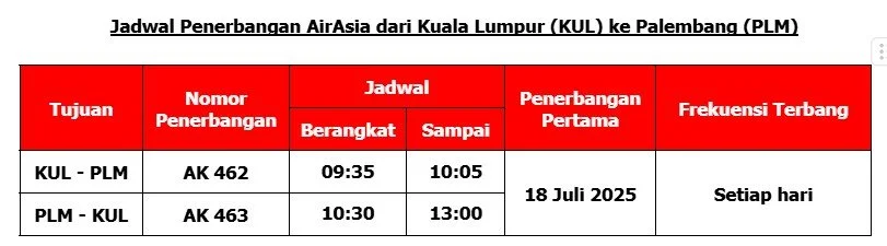 PALEMBANG, 18 Juli 2025 – Maskapai berbiaya hemat terbaik dunia versi Skytrax, AirAsia Malaysia (kode penerbangan AK) hari ini resmi melayani rute internasional ke Palembang, Indonesia, melalui penerbangan perdana dari Kuala Lumpur yang menandai kembalinya status internasional Bandara Sultan Mahmud Badaruddin II.