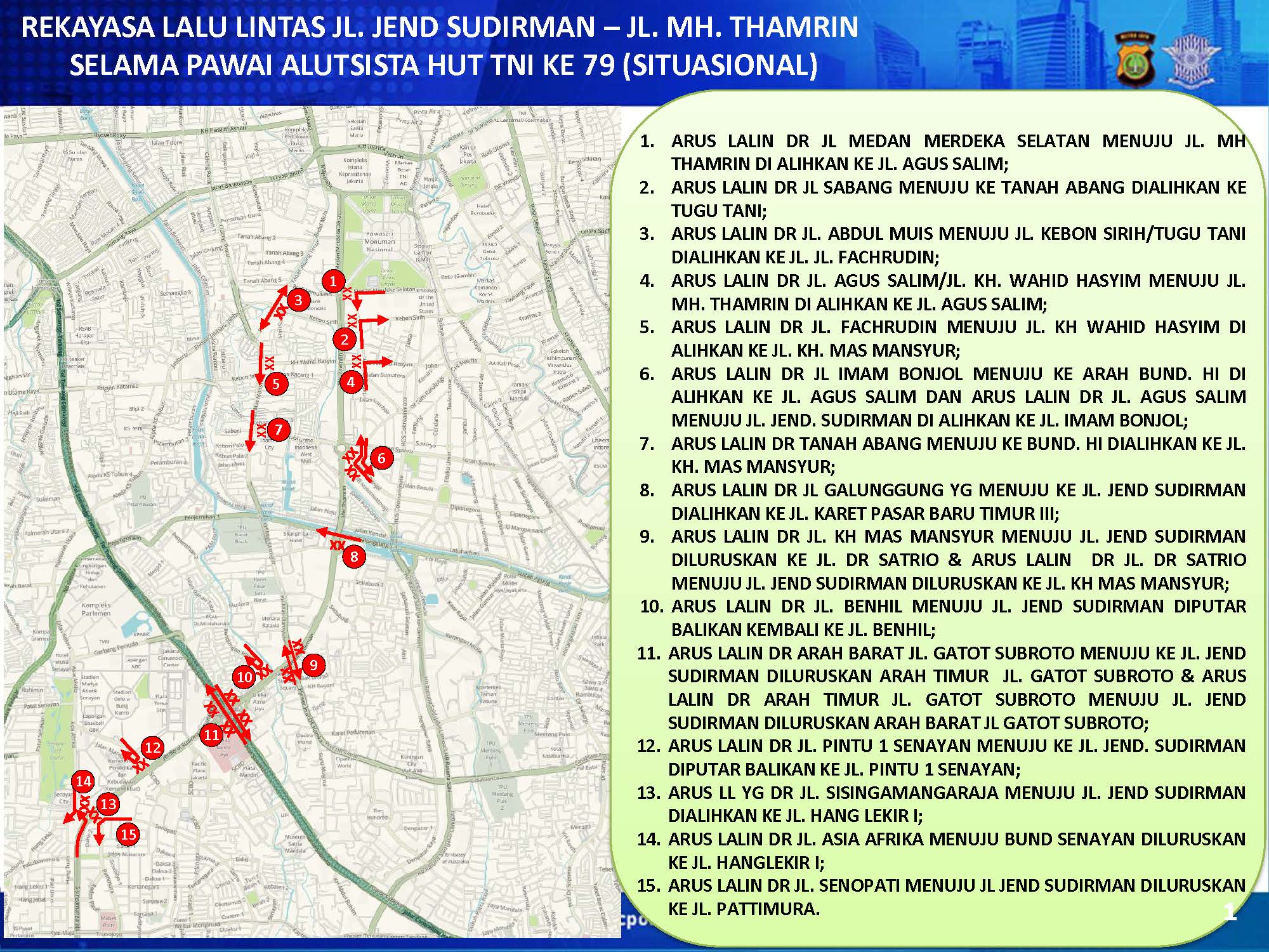Sejumlah ruas jalan utama di Jakarta Pusat akan ditutup total selama pelaksanaan acara. Beberapa di antaranya adalah: