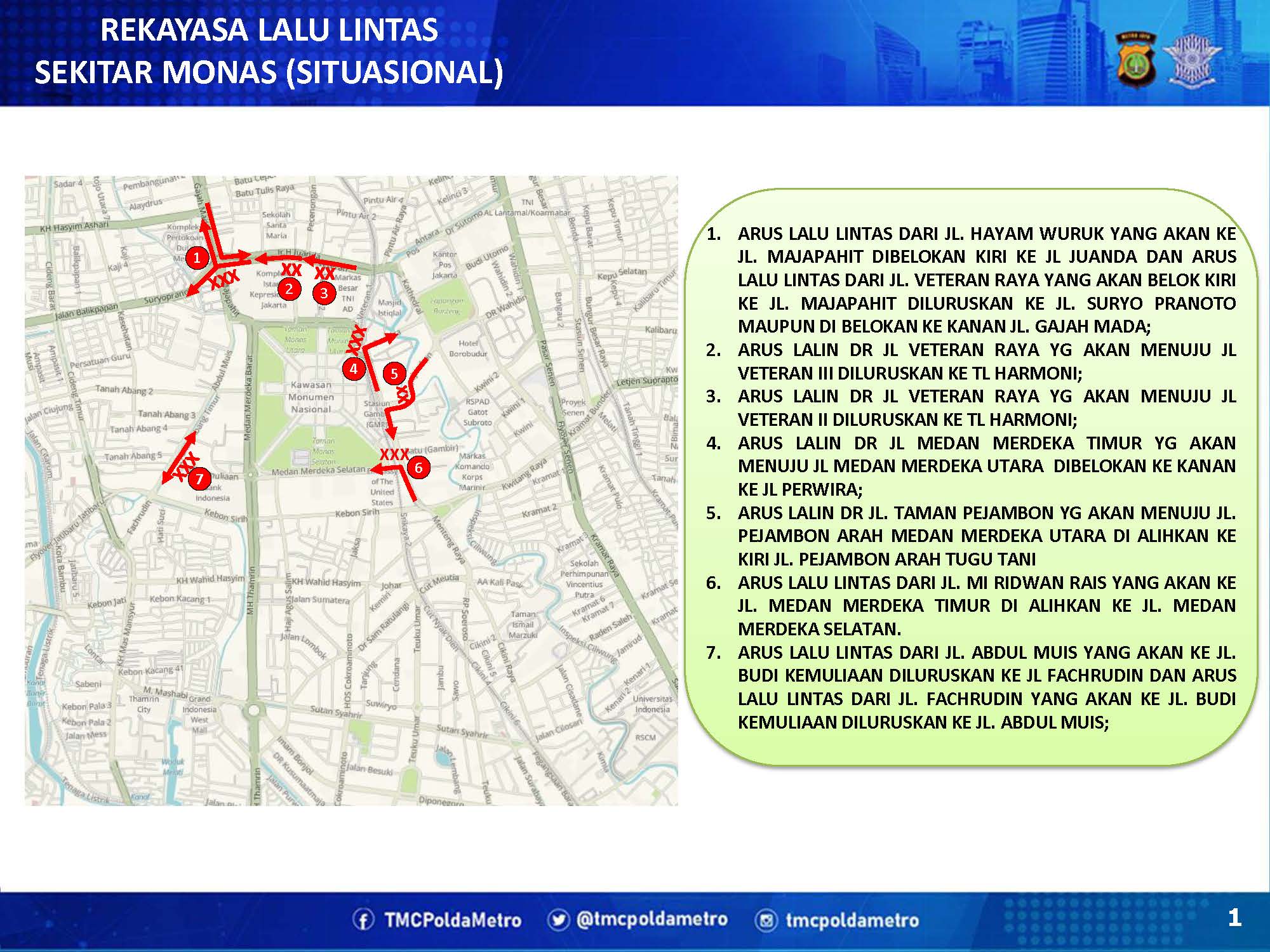 Polda Metro Jaya mengimbau kepada masyarakat untuk menghindari sejumlah ruas jalan yang telah ditentukan dan mencari alternatif rute perjalanan. Masyarakat juga dihimbau untuk selalu memperhatikan rambu-rambu lalu lintas dan mengikuti arahan petugas di lapangan.