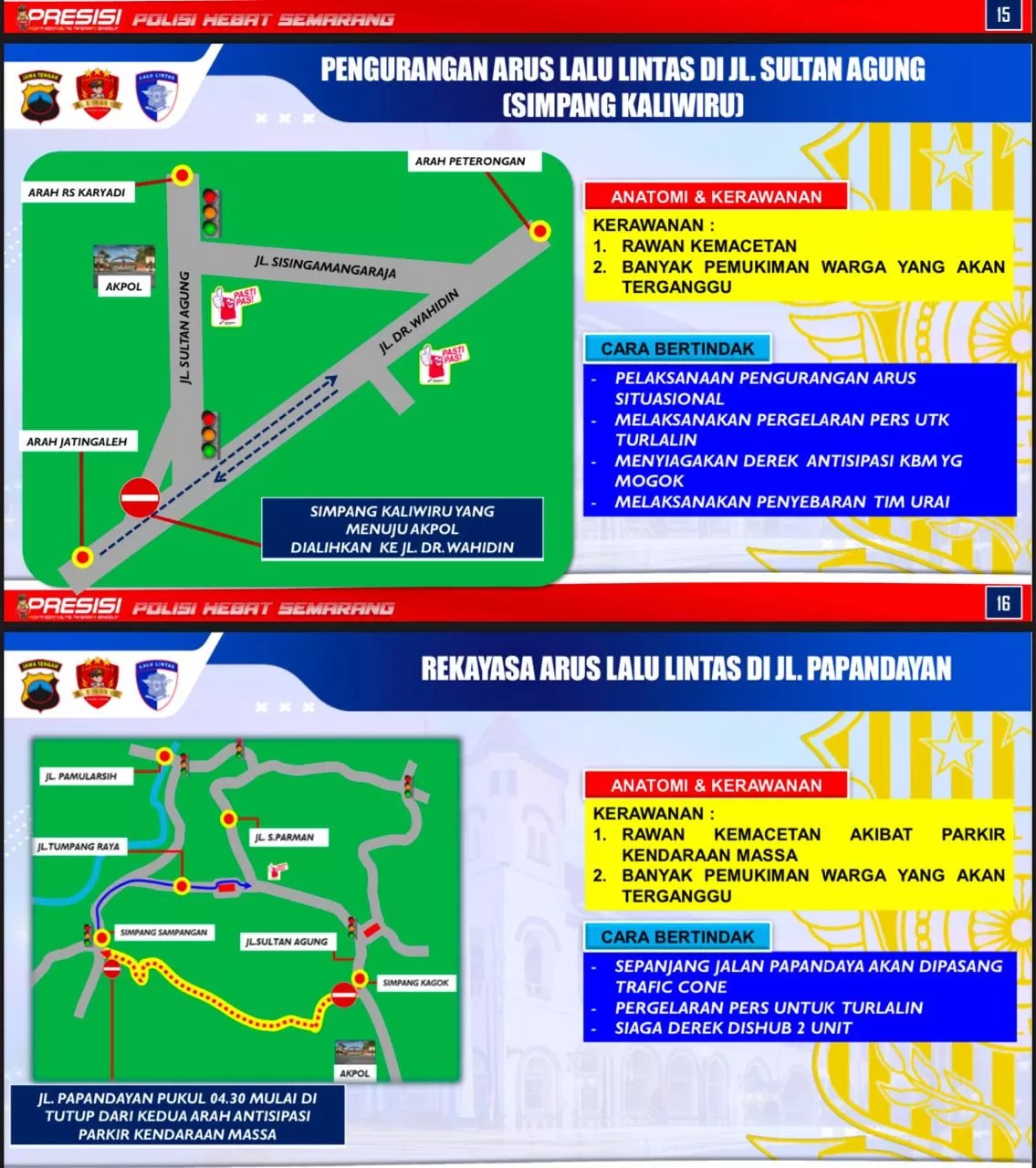 “Kunjungan Presiden RI di Semarang dalam rangka peresmian FO Madukoro dan kegiatan Apel Kasatwil Polri di Akpol. Mengingat potensi kepadatan lalu lintas di Jl. Sultan Agung Semarang, kami imbau masyarakat demi kelancaran untuk menghindari jam padat lalu lintas di area-area tersebut ,” ujar Kombes Pol Artanto.