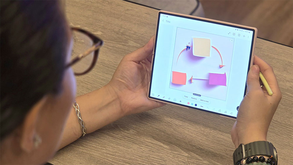 Setelah mendapatkan ide atau referensi, Andira biasanya mulai membuat pitch deck untuk kemudian didiskusikan dengan investor ataupun rekan bisnis lainnya. Kegiatan meramu deck yang atraktif memang jadi salah satu aktivitas favorit Andira karena dirinya bisa menuangkan ide-idenya di materi tersebut. Tapi terkadang ide-ide muncul kapan saja dan di mana saja. Andira memanfaatkan Galaxy Z Fold6 untuk membuat deck yang menarik sesuai keinginannya tanpa memakan waktu yang lama, bahkan ketika dia sedang on the go. Untuk melakukan hal tersebut, Andira menggunakan Sketch to Image at Samsung Notes.