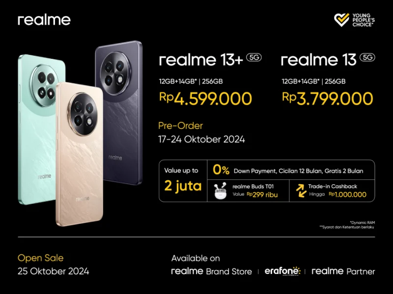 Melanjutkan Number Series terbaru di Indonesia, realme secara resmi menghadirkan realme 13 Series 5G di Indonesia. Brand Pilihannya Anak Muda ini mengguncang segmen smartphone kelas menengah dengan realme 13+ 5G dan realme 13 5G yang mengedepankan performa gaming mulus hingga tingkat turnamen. Mengusung konsep Performance Beyond Limits, realme 13+ 5G mampu sajikan kelancaran performa sekaligus visual dengan dukungan 90fps di berbagai judul game mainstream, bahkan hingga 120fps di game Honor of Kings. realme juga menambahkan produk TWS terbaru dengan menghadirkan realme Buds T310 yang menawarkan audio kelas atas melalui 46dB Hybrid Active Noise Cancellation di rentang harga terjangkau. realme 13+ 5G tersedia dengan harga spesial Rp4.399.000 eksklusif di Shopee, akulaku, dan realme.com. Sedangkan realme 13+ 5G tersedia dengan harga spesial Rp3.599.000 di semua kanal ecommerce resmi yaitu Shopee, TikTok Shop, Tokopedia, Lazada, Blibli, akulaku, dan realme.com. Harga spesial tersebut bisa didapatkan saat online Flash Sale yang diadakan hanya satu hari pada 25 Oktober 2024, mulai pukul 00:00 WIB.