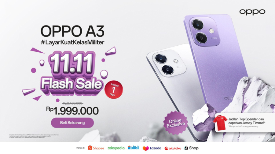 OPPO A3 yang dikenal sebagai smartphone tangguh dengan desain stylish di kelasnya, dapat dimiliki hanya dengan seharga Rp1.999.000 pada promo 11.11 kali ini. Tak hanya itu, setiap hari akan ada flash sale untuk produk OPPO pada jam tertentu, sehingga lebih banyak konsumen bisa memiliki dan merasakan keunggulan dari produk teknologi dan smartphone terbaik OPPO.