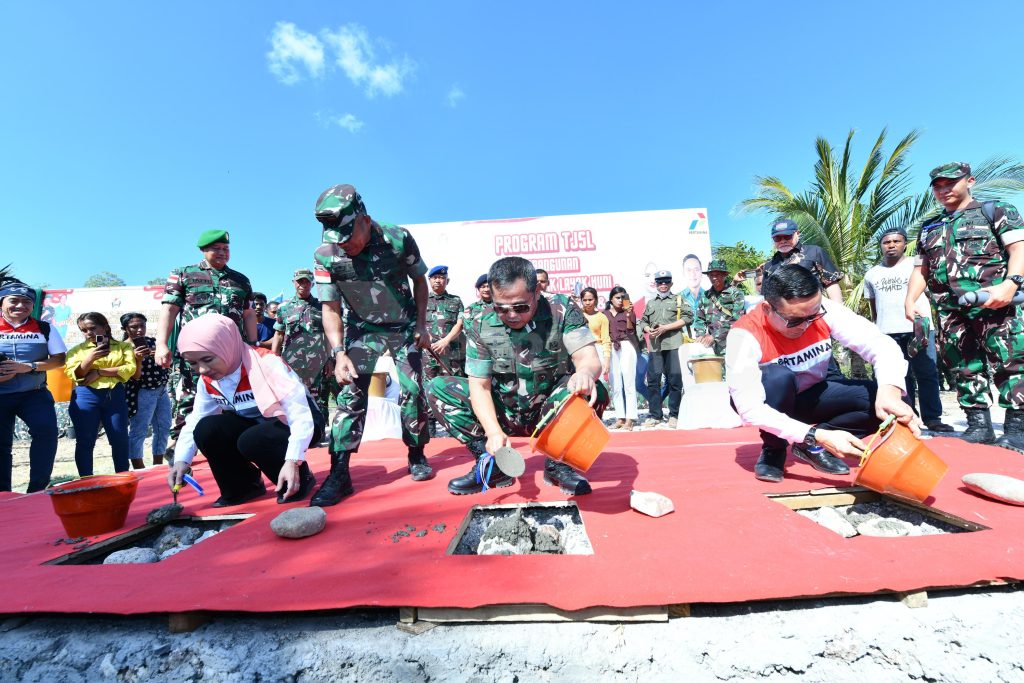 KUPANG – Kepala Staf Angkatan Darat Jenderal TNI Maruli Simanjuntak (tengah), Direktur Utama Pertamina Nicke Widyawati (kiri) dan Komisaris Utama Pertamina Simon Aloysius Mantiri (kanan) meletakkan batu pertama untuk Pembangunan Rumah Layak Huni di Desa Manusak Kupang Timur, Selasa (30/7).