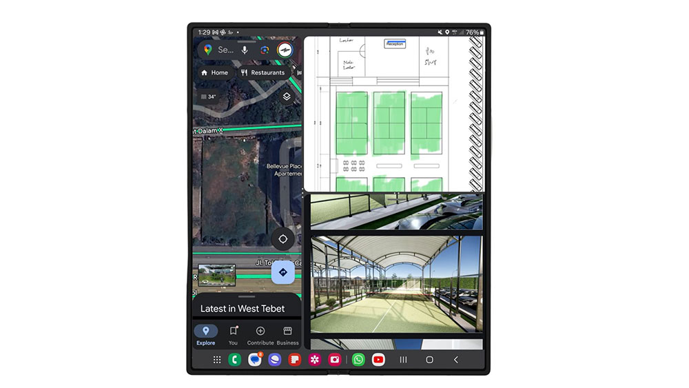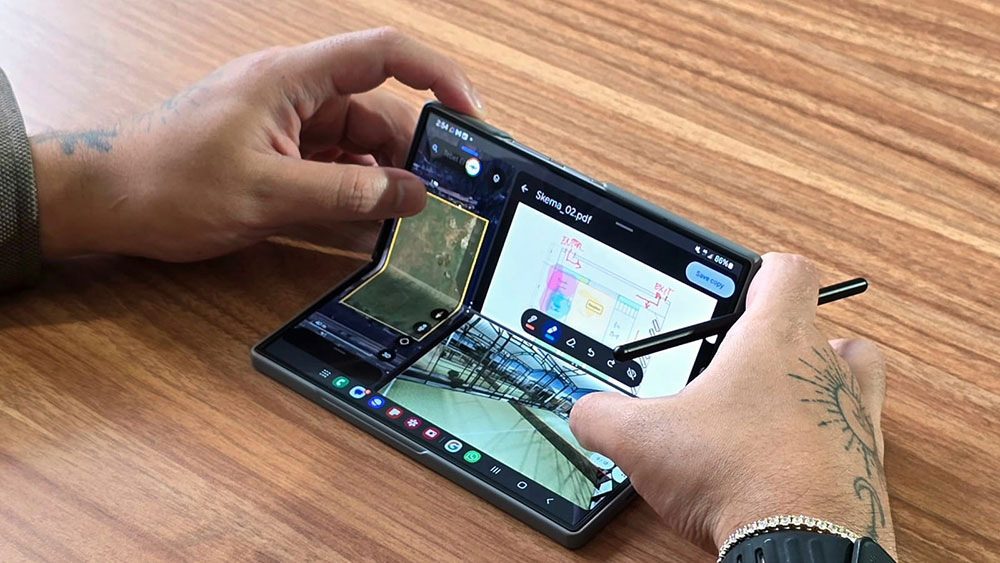 Galaxy Z Fold6 memiliki dimensi layar yang lebih lebar dibanding pendahulunya, yakni 68.1 x 153.5 x 12.1 mm saat tertutup dan 132.6 x 153.5 x 5.6 mm saat perangkat terbuka. Dia jadi bisa mengirim dokumen kepada partner bisnis lebih cepat, cukup drag and drop dokumen seperti pengalaman yang dia rasakan saat menggunakan laptop. Biasanya, Aero akan memaksimalkan 3 windows yang ada di Galaxy Z Fold6.
