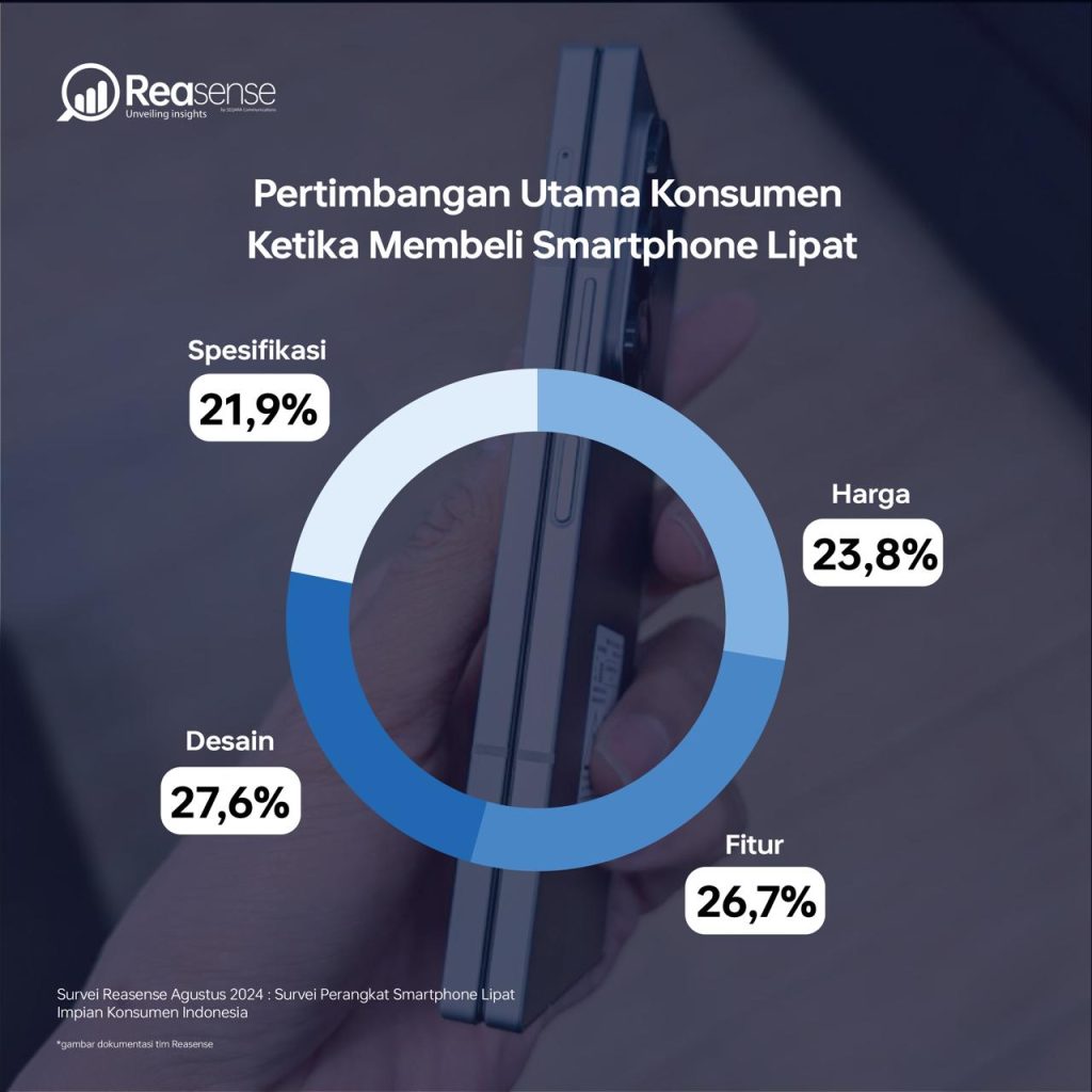 Selain kesadaran merek, survei juga mengungkap faktor-faktor yang paling mempengaruhi keputusan konsumen dalam memilih smartphone lipat. Desain menjadi pertimbangan utama dengan persentase 27,6%, diikuti oleh fitur (26,7%) dan harga (23,8%). Menariknya, spesifikasi teknis (21,9%) tidak masuk dalam tiga besar pertimbangan. Masuknya desain sebagai salah satu pertimbangan utama menunjukkan bahwa konsumen saat ini menginginkan perangkat yang tidak hanya fungsional, tetapi juga estetik dan mampu merefleksikan gaya pribadi mereka, meskipun tetap melihat nilai yang ditawarkan oleh brand.