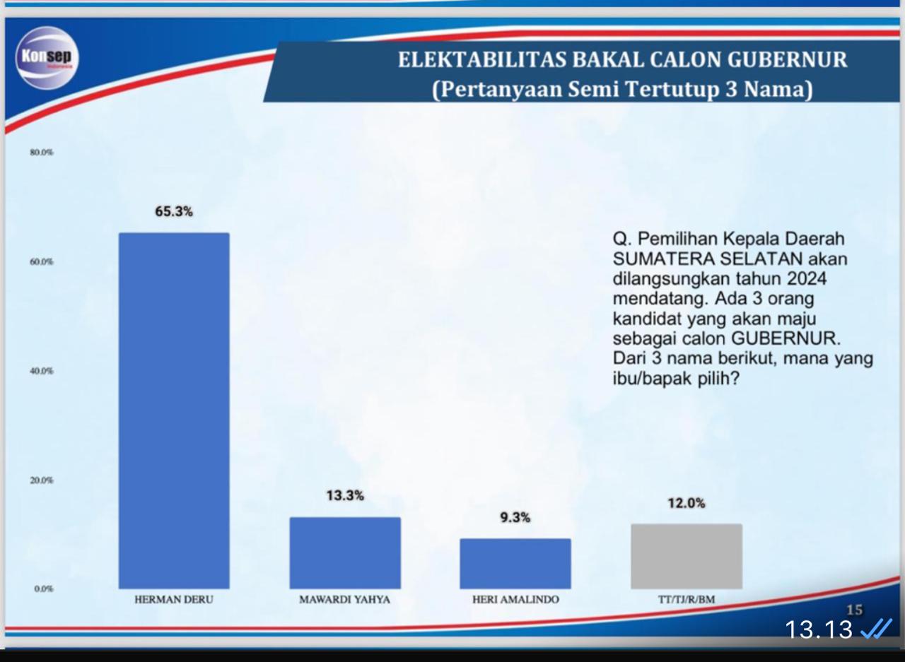 Kemudian menurut survei Konsep Indonesia, elektabilitas Herman Deru 65,3 persen. Unggul telak dari Mawardi Yahya yang hanya 13,3 persen dan Heri Amalindo 9,3 persen.