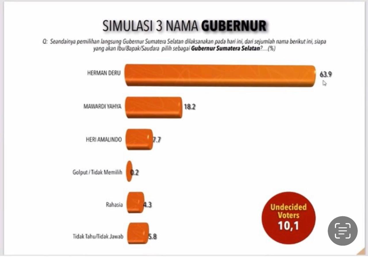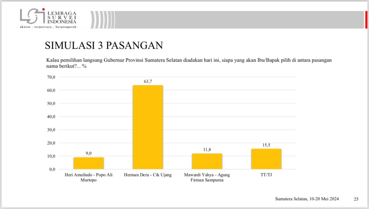 Temuan survei Lembaga Survei Indonesia (LSI), elektabilitas Herman Deru mencapai 63,7 persen. Sementara Mawardi hanya 11 persen dan Heri Amalindo 9 persen.